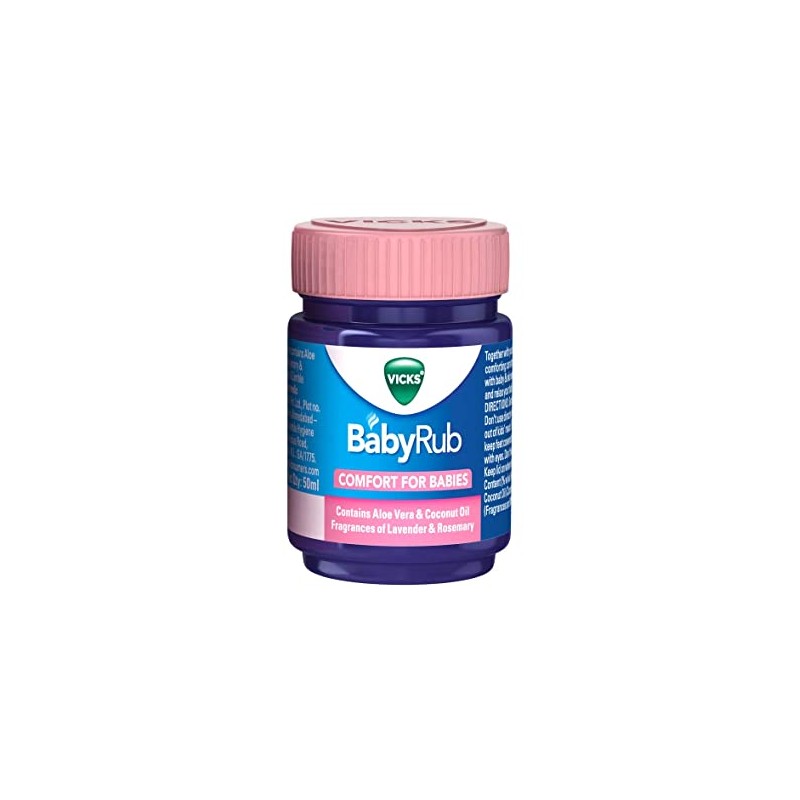 Vicks BabyRub Ointment provides moisturising & soothing comfort for delicate skin to help your baby feel calm and relaxed. An aromatic formulation containing natural extracts of Rosemary, Lavender and Aloe Vera. Nappy changes provide the perfect opportunity to bond with your baby. At night, gently massage Vicks BabyRub into baby’s chest and stomach to help moisturise, soothe and comfort.
