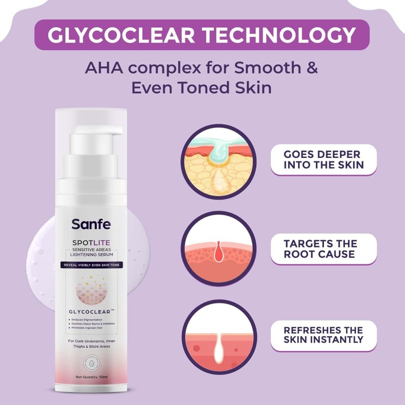Sanfe Spotlite Sensitive Body Serum For Dark Underarms, Inner Thighs and Sensitive Areas 10X Powerful Enriched with 2% Glyoclic Acid Alpha Arbutin Niacinnamide For Dark Intimate Patches Detanning Anti Aging and Skin