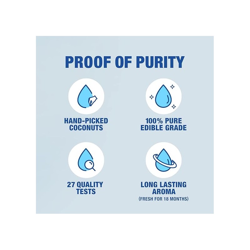 Parachute Coconut oil- India’s No.1 coconut oil contains only the goodness of 100% pure coconut oil. It is made from naturally sun-dried coconuts sourced from the finest farms of our country. The oil is extracted from the nuts through a meticulous hands free process. It goes through a 5 stage purification process and as many as 27 quality tests are performed on the oil so that each bottle that reaches you is 100% pure- EVERY SINGLE TIME. A tamper proof seal ensures that the rich aroma of raw coconuts is preserved for a long time. It contains no added chemicals, scent, additives or preservatives and lasts fresh & safe for up to 18 months. It is licensed by FSSAI as an edible grade coconut oil. All this ensures that every bottle of coconut oil adheres to the Parachute promise of being 100% safe and 100% pure.