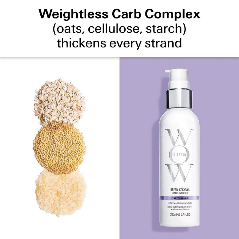 Carb-infused Dream Cocktail thickens and adds mass to hair by surrounding each strand with an invisible, weightless carb-based complex (cellulose, starch and oat bran) that is activated by the heat of your blow-dryer.