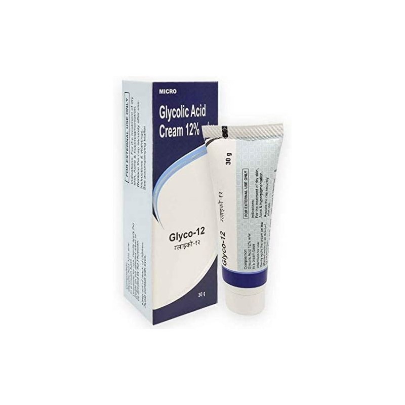 Glyco-12 cream is a hydrophilic emollient containing contains Glycolic acid 12%. Glycolic acid specific separate effects on different layers of the skin. On the outer layer of the skin, the epidermis, it appears that the glycolic acid will cause an ungluing of the cells which have stuck together in an unhealthy way.On the deeper layer of the skin, the epidermis, there are microscopically demonstrated effects showing an increase in the deposition of collagen and other proteins which lead to better supported and healthier skin.