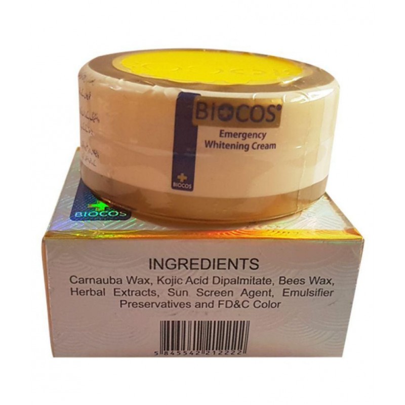 Biocos emergency whitening cream ought to be figured from exacerbates that show guarantee in helping skin tone, a capacity that may likewise incorporate decreasing the conspicuousness of spots and other dull spots. Biocos whitening cream is a technologically advanced tipple action formulation that contains rare and uncommon fruit and plant extracts to penetrate deep in to the skin, the result is new, fresh, illuminated, enlightened, radiant fair skin. Biocos Emergency Whitening cream additionally contains sunscreens to Protect the skin from harmful UVA & UVB rays that can darken the skin.
