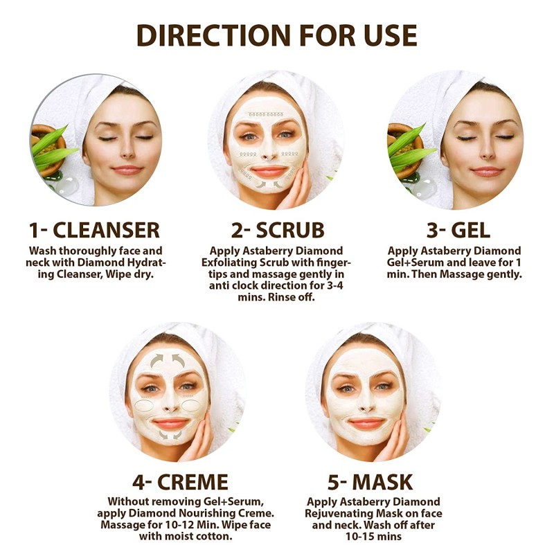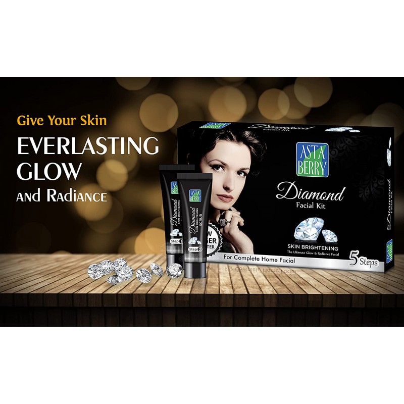 • Astaberry Diamond Facial kit contains the most superior active ingredients like Heera Bhasm, Jojoba Oil, Bearberry Extracts and Carrot Oil to give your skin the everlasting glow and radiance.