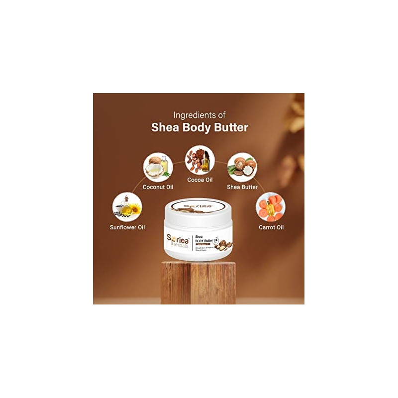 Spriea Herbals natural Shea body butter is infused with the goodness of 3 skin healthy oils of Sunflower oil, Carrot oil, and Coconut oil. Cocoa butter creates a protective barrier that holds in moisture and prevents your skin from drying.