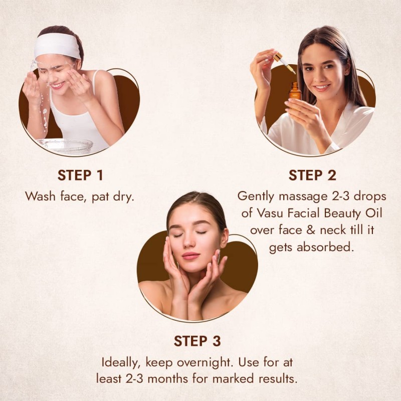 Vasu Facial Beauty Oil blends the Traditional Beauty recipe of Kumkumadi Tailam with clinically- proven Natural Plant Actives to offer a unique product that gives a Natural Glow to face, overcoming hyper-pigmentation, age spots, wrinkles and blemishes. Made with 100% Natural Ingredients, contains 0% Mineral Oil, silicones, 0% Artificial Fragrance & Color. It's a cruelty free product.