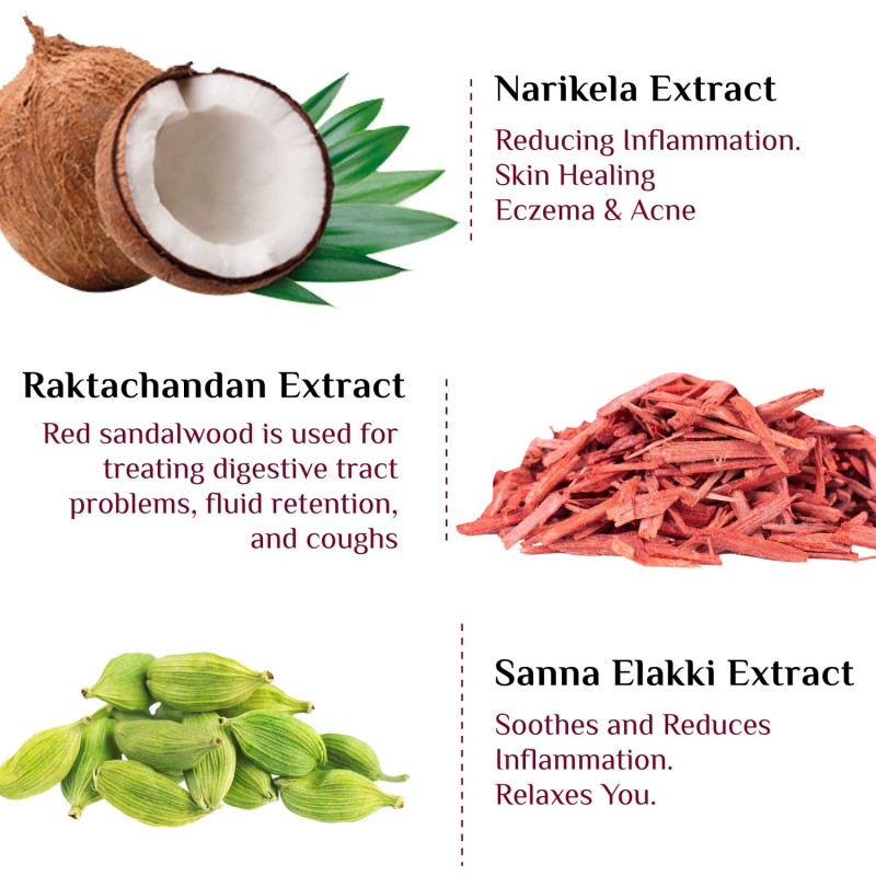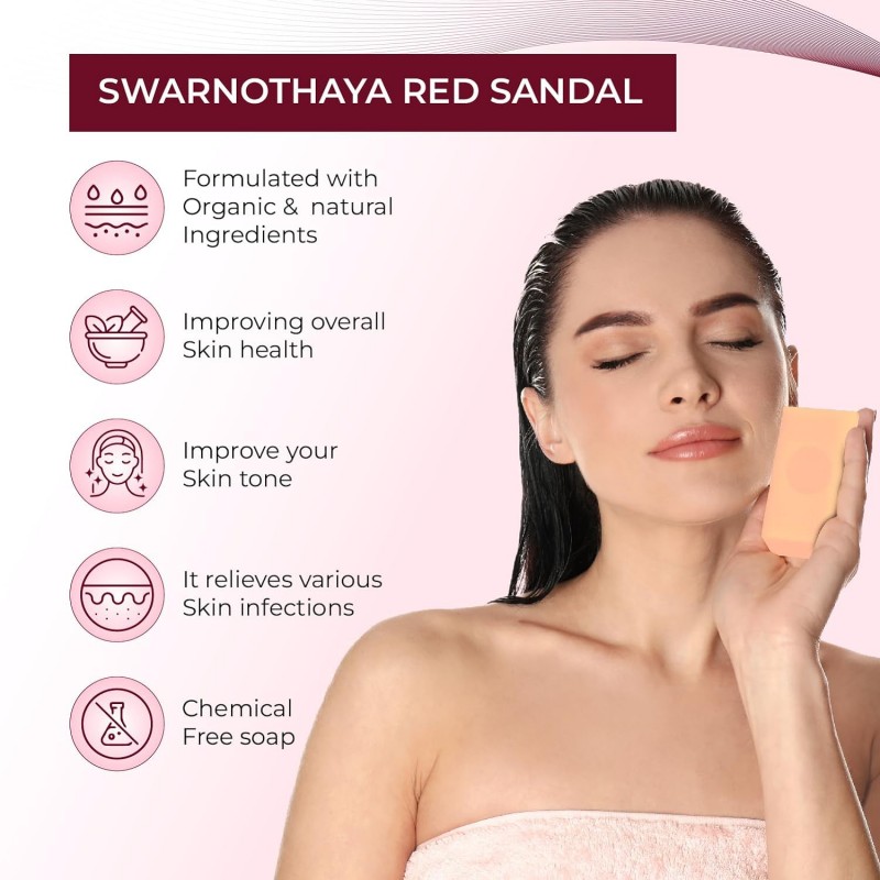 Swarnothaya Red Sandal Soap includes the heavenly mixture of red sandal and coconut oil, both being ingredients that possess healing properties. Hand Made Red sandal helps remove pimples, blemishes, protects you from pigmentation and prevents the occurrence of heat rashes. Coconut oil, on the other hand, nourishes your skin, hydrates it and gives it a face-lift. The soap makes your skin smooth, soft and acne-free! It also works against dark spots on the skin and helps lighten their appearance.