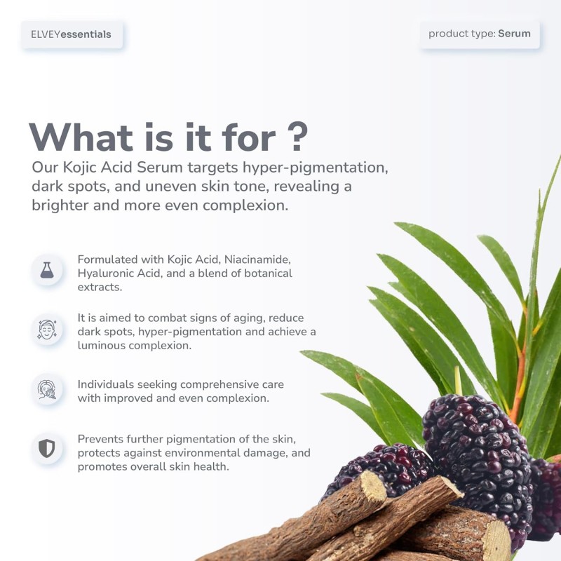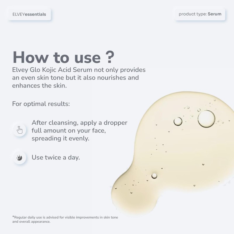 Effortlessly incorporate the Elvey Glo 2% Kojic Acid Face Serum into your daily skincare routine. Its lightweight formula allows seamless layering with your favorite moisturizer and sunscreen, ensuring a simple yet effective regimen for glowing, healthy skin.