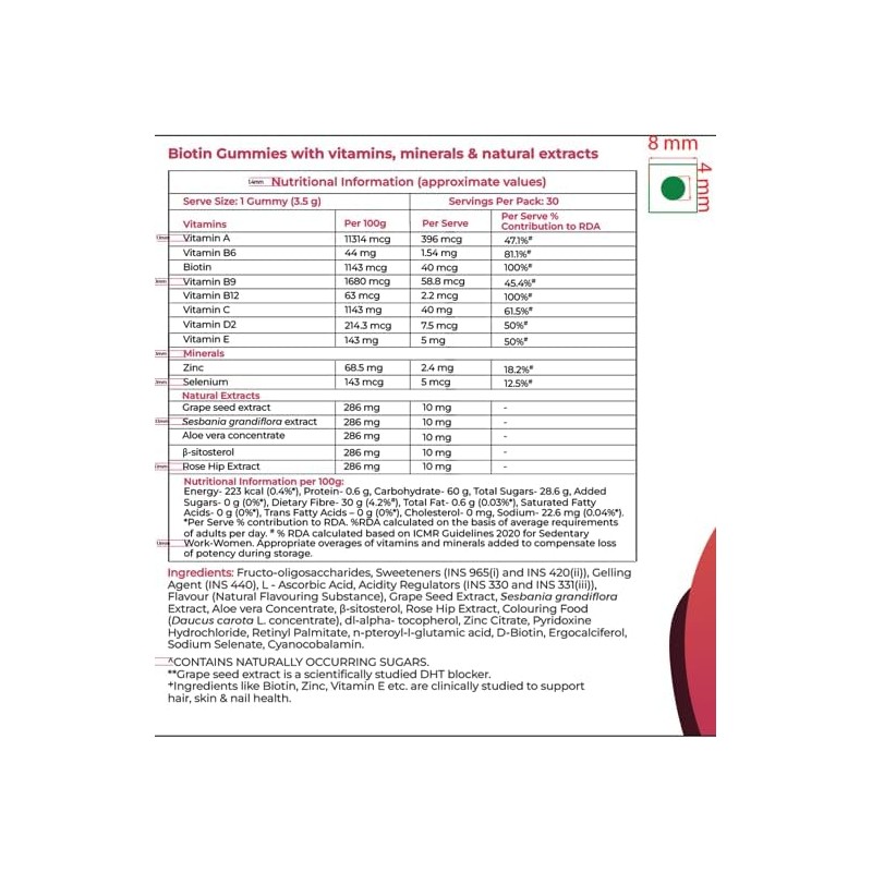 Biotin, Grapeseed, Selenium helps strengthen brittle nails, reducing breakage and promoting nail health. These delicious strawberry flavoured gummies have No Added Sugars, Non-GMO, By its nature Gluten Free.