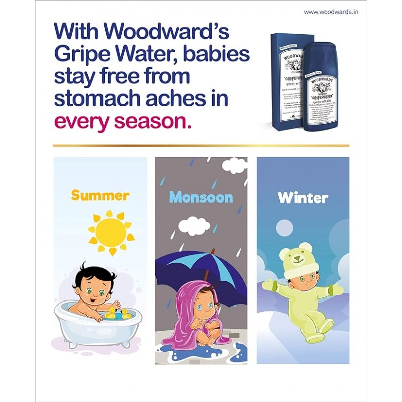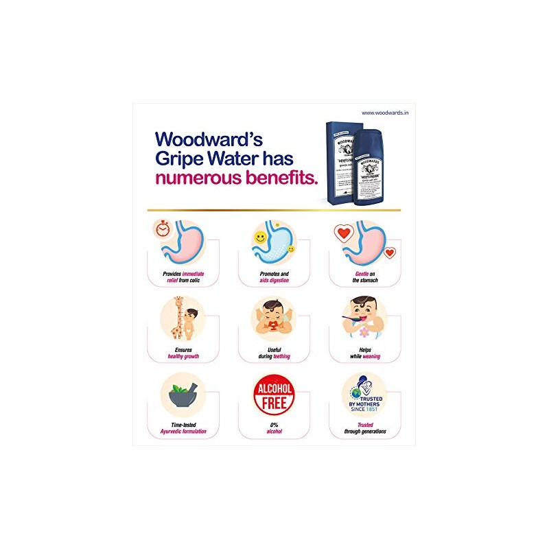 Woodward's gripe water is an ayurvedic formulation with a combination of dill oil and sarjikakshara that provides symptomatic relief – from stomach pain caused due to gas, acidity and indigestion in infants and children. It is absolutely safe – strict checks are done at every stage of the manufacturing process to ensure quality and hygiene of the product. Generations of mothers have trusted woodward's to provide colic remedies to their crying babies.
