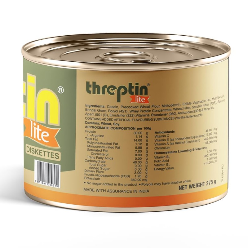Threptin Lite High-Protein Supplement Diskette is a protein supplement that provides sustained energy and improves strength. It is sugar-free and suitable for people with diabetes and calorie-conscious individuals.