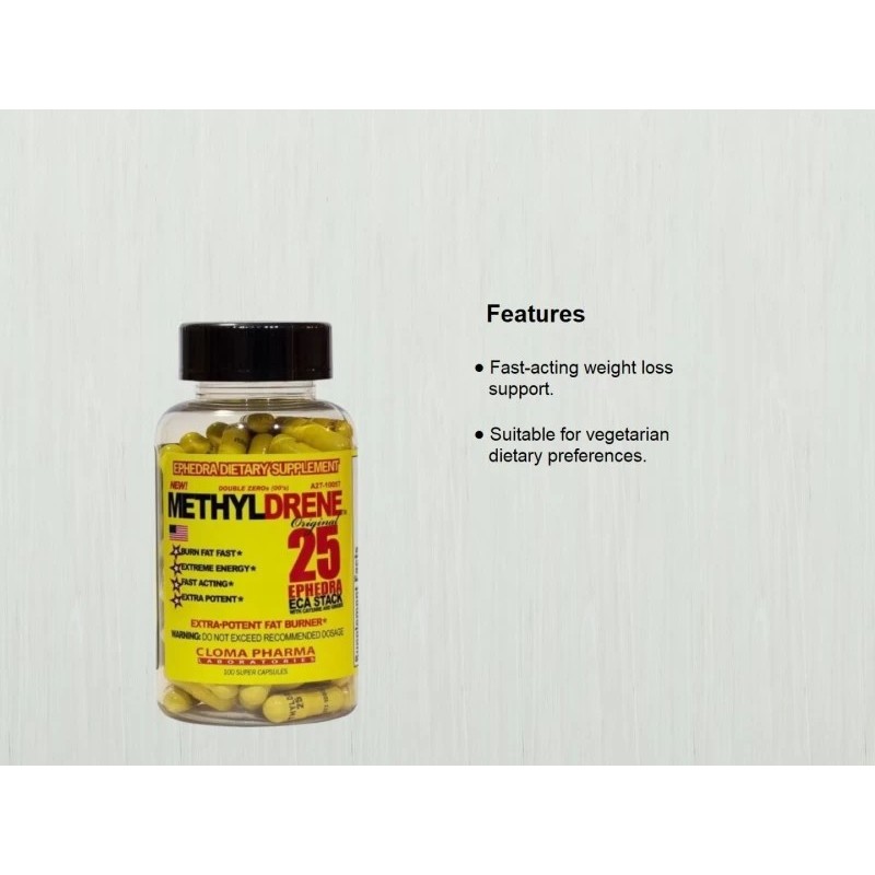 Weight loss and fat burning go hand in hand, but when it seems like diet and exercise aren't enough, what's a person to do? With Methyldrene 25 ephedra from Cloma, a user can not only enjoy fat burning ingredients, but also the support to help them stick with a diet and exercise plan.