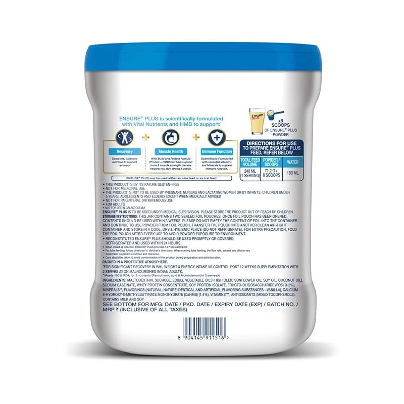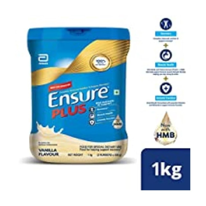 Ensure Plus Vanilla Powder is a scientifically formulated health supplement that provides balanced nutrition with vital nutrients to support recovery, muscle health, and immune function. It is made with more than 28 vital nutrients, vitamins, minerals, and HMB to support special dietary requirements for recovery.