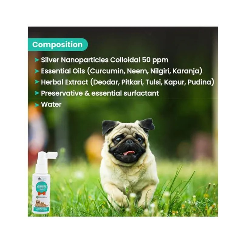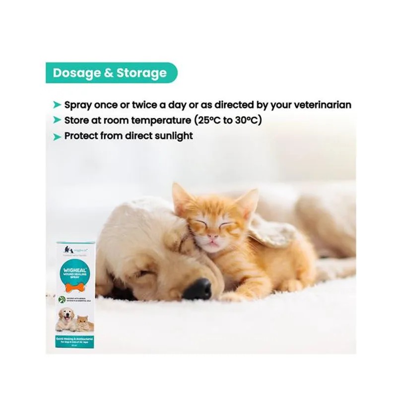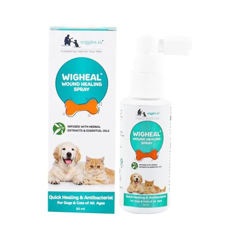 Wigheal is a vet-approved, antiseptic spray that heals wounds fast and naturally It works its herbal magic on scratches, skin abrasions, wounds and even deep pyoderma Made with silver nanoparticles, it prevents infections, decreases bacterial load in the wound with their broad-spectrum antimicrobial properties Herbal extracts like deodar, pitkari, tulsi, kapur and pudina have fly repellent actives that keep them from hovering over your pet's wound Essential oils help prevent scarring by promoting cell, tissue growth and blood clotting It also fights infections and speeds up the healing of wounds And Wigheal is safe to use for dogs and cats of all age and breed! Directions of use: Deep clean the wound with an antiseptic solution, remove dirt and then spray on the wound.