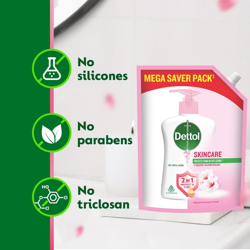 Be 100% sure to protect your skin from 100 illness-causing germs and bacteria. Use Dettol's Skincare Germ Protection Handwash Liquid Soap pH balanced formula every day and keep your hands hygienically clean and refreshed. This hand wash provides soft and rich lather, leaving behind clean hands and fragrance. The trusted germ-protection modus operandi acts like a barrier between your hands and a wide range of unseen germs. The soap-free formula with glycerin makes sure to keep your skin moisturised, while the plant derived cleansers help ensure thorough cleaning. Dettol handwash also contains more than 85% naturally derived ingredients with no TCC & Triclosan, giving another healthy reason for hand washing whenever in need.