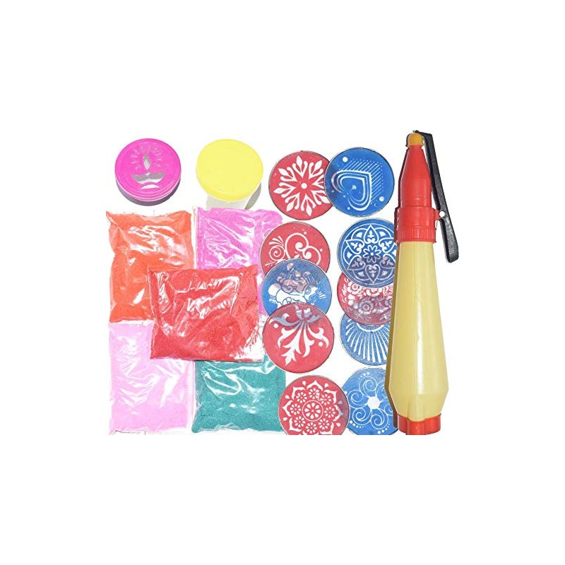 Set Includes one Rangoli Pen and Ten Stencils of 8" an Five            of 50 Gram Each (5 * 50 = 250 Gram) and one Filler and one            Stamp