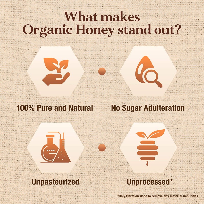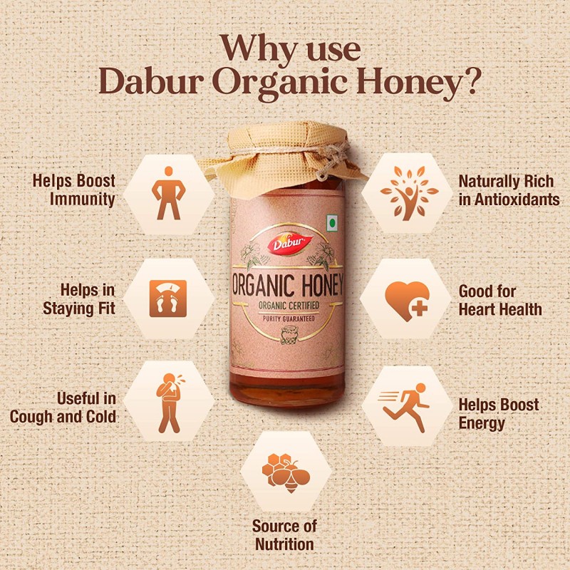 Dabur Organic Honey is procured from selected apiaries within close proximities of only organic farmlands managed without chemicals or pesticides. Dabur organic honey is pure, natural, unprocessed, and unpasteurised with no sugar adulteration. It is naturally rich in antioxidants and helps boost immunity and energy. It is a good source of nutrition and is helpful for cough and cold. It can help with multiple health benefits like improved stamina, better digestion, improved cholesterol level and maintaining a healthy lifestyle.