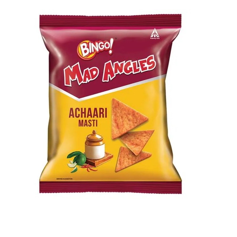 Mad Angles Achaari Masti, A triangle chip made from a corn base and cooked with rice and flour. The authentic taste of achaar is added which gives a delightful taste to the uniquely textured crunchy chips.
