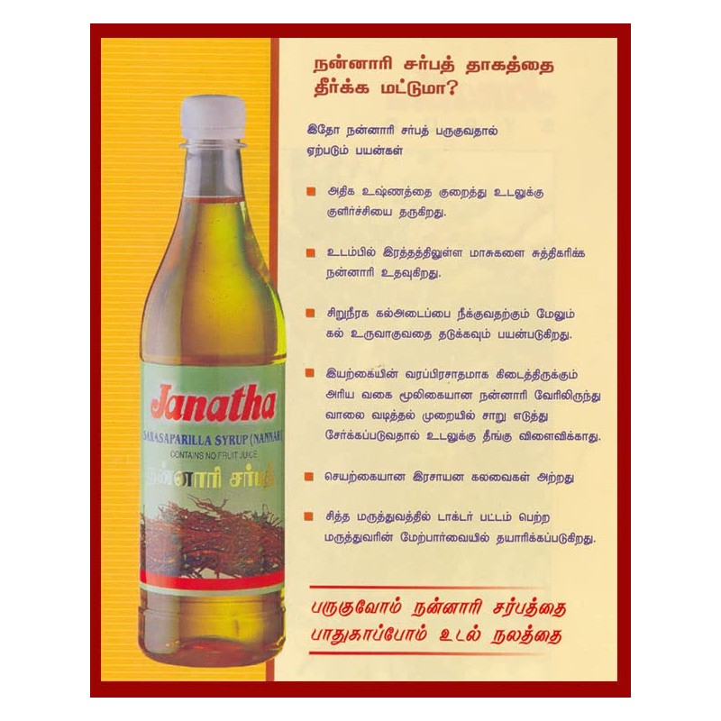 It is a delicious herbal drink. It containing sarasaparilla extract, Sugar, Water and Citric acid. Directions for use Mix two or more table spoons of Sarasaparilla Syrup with little lime juice in a glass of cold water or soda to make a delicious NANARI SARBATH. State of the Art Manufacturing facilities The fully automated highly sophisticated equipment and system can handle the processing of fruit products. A state of the art plant employing the most modern Technology is used for extraction. In our constant efforts to improve the quality we have set up a modern chemical plant in our factory itself.