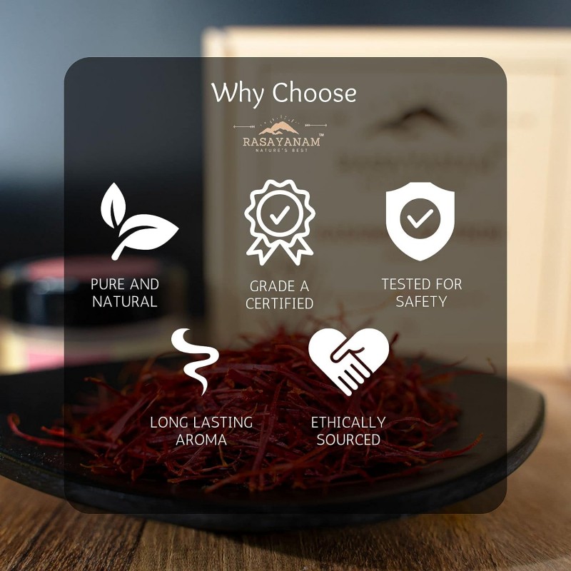 Grade A1 Certified Original Kashmiri Kesar- Tested A++ saffron by globally recognized lab as per ISO 3632 standards. Every Rasayanam kesar saffron original 1g box comes with a test report.