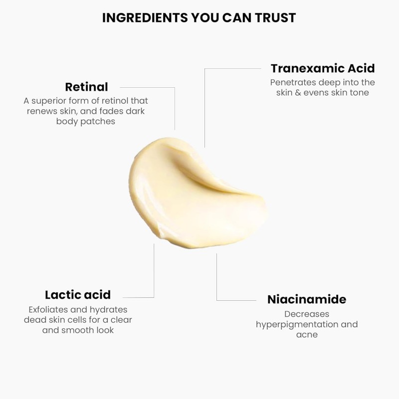 It contains Retinal, a superior form of retinol that boosts collagen, renews skin and reduces dark body patches. Tranexamic Acid penetrates deep into the skin & gives a visible even skin tone. Niacinamide decreases hyperpigmentation and makes your skin firm & plumpy. Lactic acid acts as an exfoliant, removes dead skin cells, and helps fade dark body patches, for a clear and smooth look.