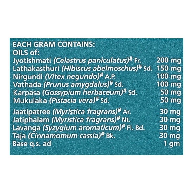 Ingredients: Jaatiphalam, Jaatipatree, Lavanga, Taja, Mukulaka, Jyotishmati, Karpasa, Vathada, Lathakasthuri, Nirgundi