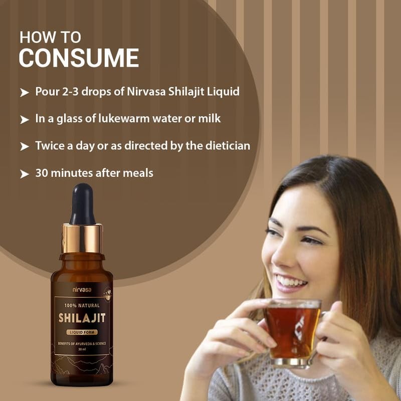 Sourced right from the ancient rocks of Himalayan mountain altitudes by way of authentic Ayurvedic processes, Shilajit liquid form is extracted by the dried Shilajit which incorporates plentiful advantages. Each 30ml of Nirvasa Shilajit Liquid contains Shilajit extract (250 mg), infused in its purest and purified form.