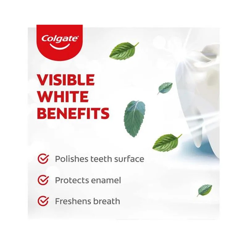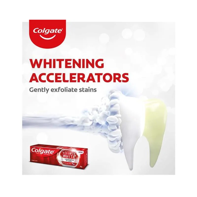 Dazzle White Dazzle Right with Colgate Visible White. Colgate Visible White Toothpaste is a unique teeth whitening toothpaste which gives you one shade whiter teeth in one week. It is Infused with whitening accelerators that gently exfoliates stains and polishes teeth surface while protecting the enamel to help you create a lasting impression with whiter teeth and smile.