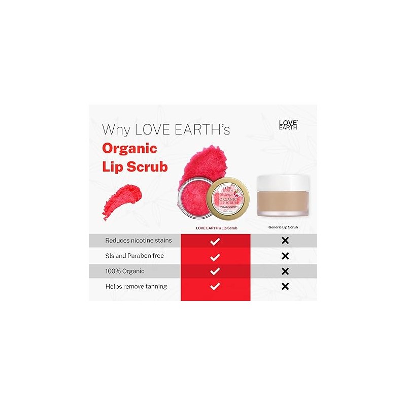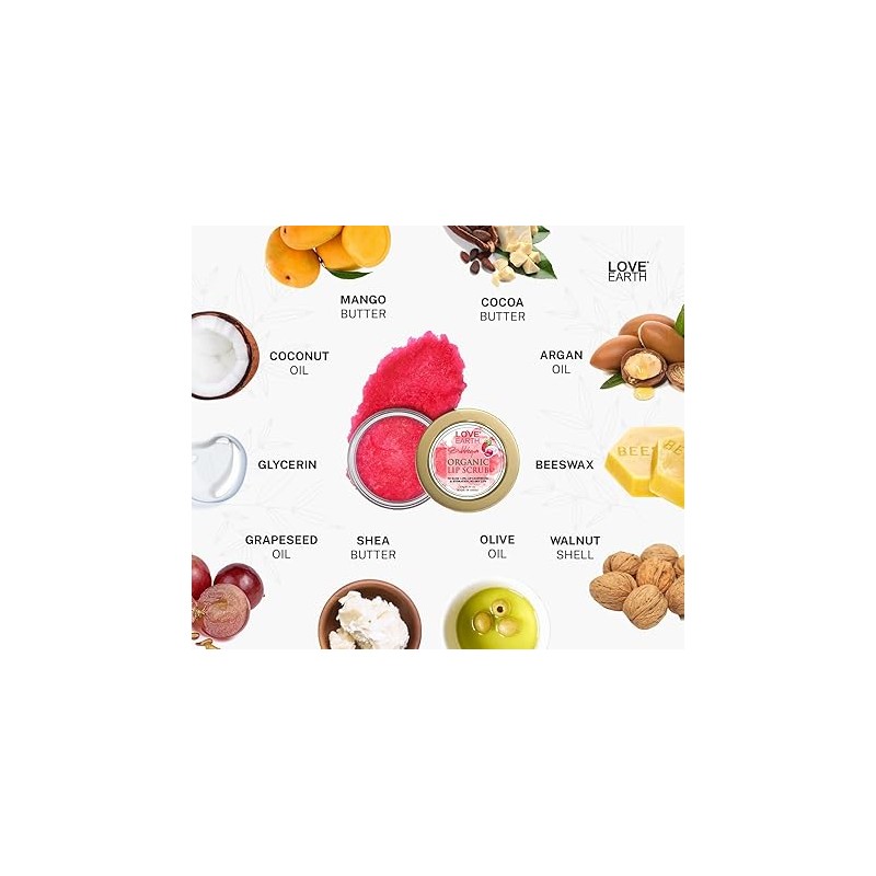 Love Earth Organic Lip Scrub Bubblegum is a lip care formulation containing a blend of natural oils, butters, and exfoliating walnut shell granules. Shea butter, mango butter, and cocoa butter support skin nourishment, while olive, argan, coconut, and grapeseed oils may help lock in moisture and support lip texture. The presence of walnut shell gently exfoliates the lips, removing dry and flaky skin without harsh abrasiveness. This scrub is crafted to help restore smoothness and support the healing of cracked lips, leaving them supple and refreshed. The formula is free from parabens and not tested on animals, making it suitable for your lip care routine.