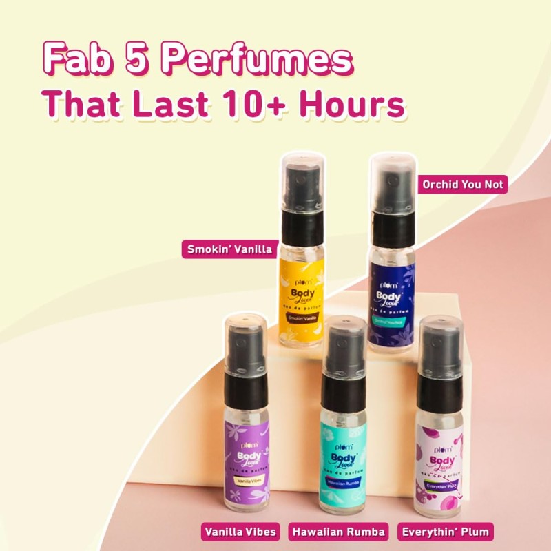 • THE FAB 5: Pick from 5 scent-sational & much-loved fragances and be one step closer to picking your signature scent! | Vanilla Vibes - Smell Like A Cupcake | Smokin' Vanilla - Spicy Vanilla Goodness | Hawaiian Rumba - Hawaii In A Spritz | Orchid-You-Not - Vibrant & Soothing Orchids | Everythin' Plum - Peppy, Juicy & Exciting