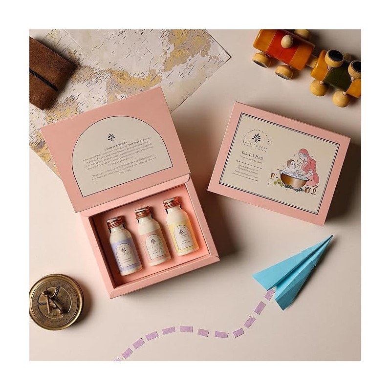 Discover the perfect travel companion for your little one with the Tuk Tuk Potli Baby Travel Kit. A thoughtfully curated set of baby bath ritual products inspired by the wisdom of Ayurveda. This ultra-luxe kit features gentle, natural formulations designed to nurture and protect your baby’s delicate skin and hair while on the move. Inside the kit, you’ll find Sampoorna Snan Baby Body Wash, Moh Malai Baby Body Lotion, and Nikhrae Kesh Baby Shampoo, each crafted to deliver derma-safe, vegan, and cruelty-free care. Whether it’s a weekend getaway or a longer journey, this kit ensures your baby’s well-being remains a priority with nourishing, soothing ingredients that promote healthy skin and soft hair.