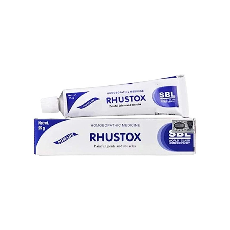 SBL Rhustox Ointment is Effective for rheumatic, sciatic pains, joint pains and muscular painsPain in multiple joints. It Treats hot and painful swelling of joints, stiff joints and stiffness of nape and neck and Provides relief to backache. It Addresses complaints that arise after sprains, over work, getting wet after perspiration. Reduces tearing pain along ulnar nerve. Treats numbness and formication, after overwork and exposure. Effective for the treatment of eptic conditions of skin with eruptions, eczema.
