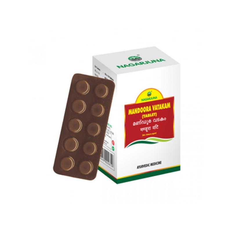 Nagarjuna Mandoora Vatakam contains Tapya (Swarnamakshika Bhasma), Darvi Twacha (Berberis aristata), Chavya (Piper chaba), Granthika (Piper longum), Devadaru (Cedrus deodara), Vyoshadi Navaka (Pepper, Long pepper), Ginger, Amla (Emblica officinalis), Haritaki (Terminalia chebula), Vibhitaki (Terminalia bellirica), Musta (Cyperus rotundus), Vidanga (Embelia ribes), Chitraka (Plumbago zeylanica) and Mandoora (Purified Ferric oxide) as a combination of ingredients.
