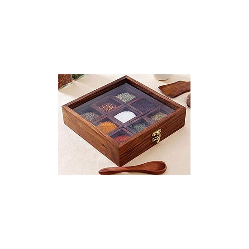 • This sheesham wooden box with 9 sections and a spoon is great to store Indian spices This multipurpose utility box can also be used to store and serve refreshners, dry fruits and keep your knick knacks like jewellery, small items at one place