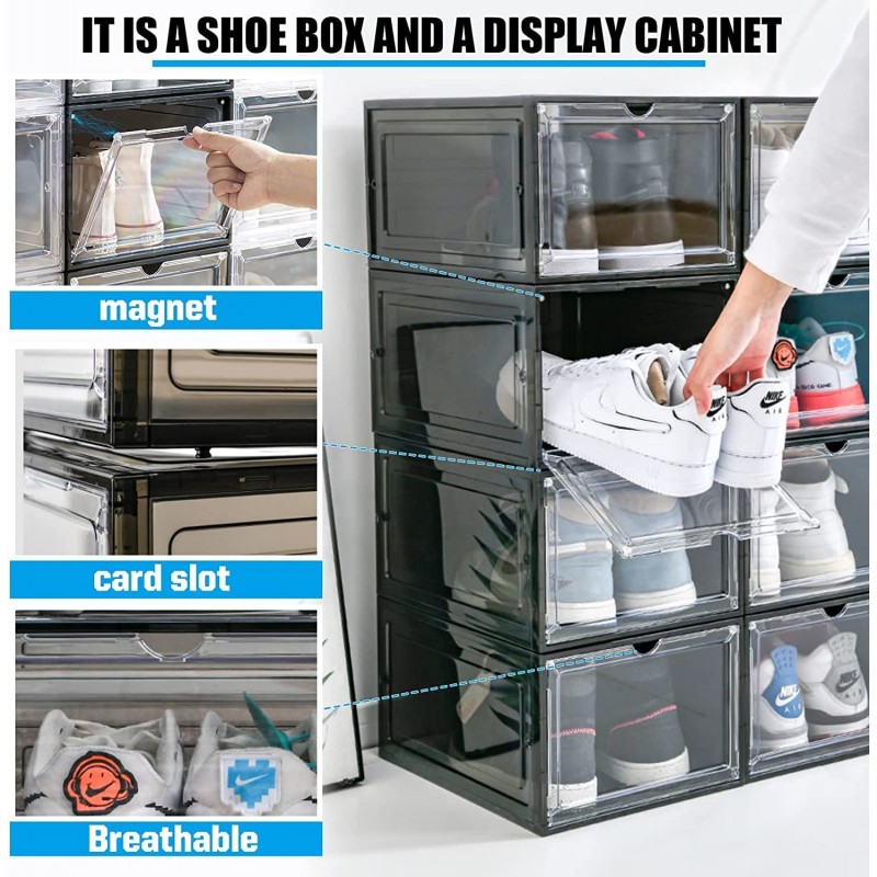 •          WIDE RANGE OF APPLICATIONS:The plastic shoe boxes with lids can be widely used to store sports shoes, high heels, high-top shoes, slippers, so that you can say goodbye to the trouble of clutter in the room. In addition, the shoe containers can also be used to store cosmetics, toys, keys and other small items to make your room more tidy.