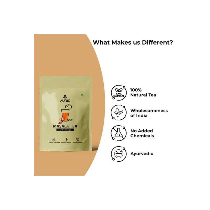 Auric's Moringa Masala Tea is the finest and most flavourful black tea with Moringa and 7 spices sourced from different parts of the country. First Flush Black Tea from Assam, Finest Moringa from Dooars (West Bengal), High Grade Best Quality Ginger from Sikkim, Cinnamon & Cardamom from Idukki (Kerala), Tulsi & Black Pepper Corn from Meghalaya and Star Anise from Arunachal Pradesh