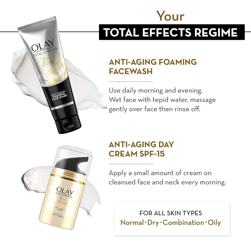 International bestseller skincare brand Olay has engineered a range of products that promises the perfect skin for all ages and across skin types. Olay total effects delivers optimal hydration to nourish skin and visibly fight the 7 signs of aging (smoothens, evens tone, brightens, refines pores, reduces age spots, restores firmness, moisturises). vitamin B5 is an anti-inflammitory and skin conditioner, boosts collagen anId treats acne. Vitamin B3 renews your cell and holds skin moisture. Anti-oxidants vitamin c, vitamin e and green tea clears skin, prevents aging and protects from harmful radicals of the environment. Visible skin results from day 1. Start with the youthful glow for your skin, now with total effects moisturiser. Directions for use: using your fingertips, massage a small amount on the face and neck in an upward circular motion, focusing on areas like the brow and jaw line, which need more support.