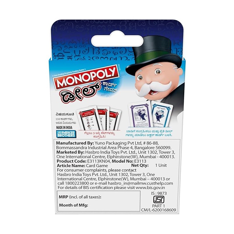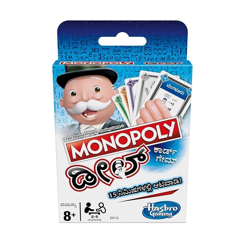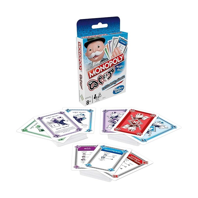• This card game is a great way to play the Fast-Dealing Property Trading Game in as little as 15 minutes! The Hasbro Gaming, Parker Brothers, and Monopoly names and logos, the distinctive design of the gameboard, the four corner squares, the Mr.