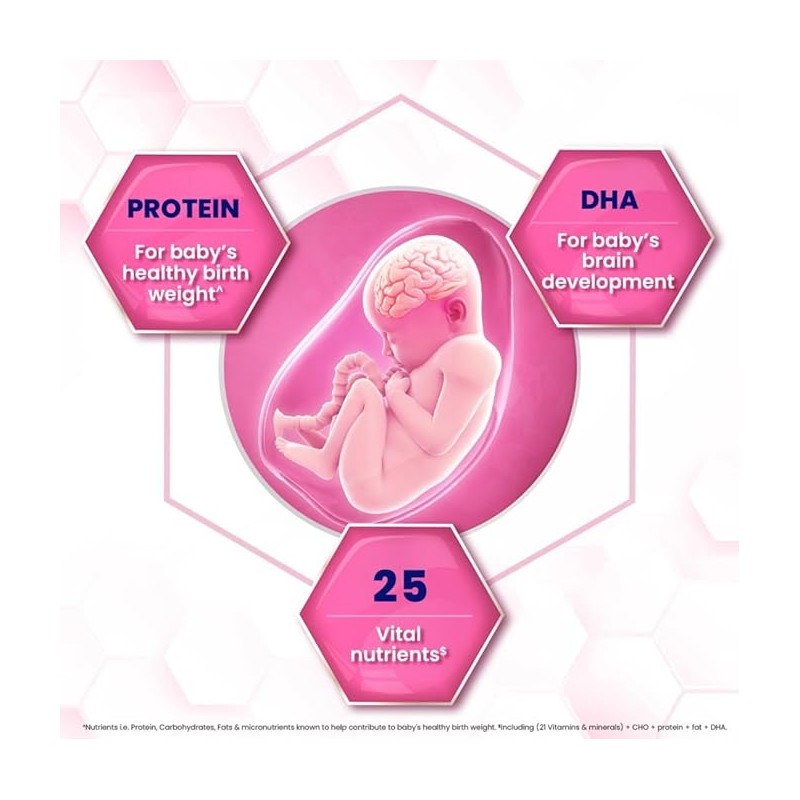 • It contains 25 vital nutrients that are important to provide the nutrition for the mother’s health and baby’s growth. It contains 100% RDAs^ of Vitamin B2|| Vitamin B12 and Vitamin C during pregnancy and 100% RDAs^ of Folic acid and Iron during lactation.