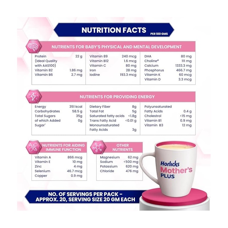 • Trusted for over 2 decades|| Horlicks Mother’s Plus is scientifically designed to provide tailor-made nutrition for pregnancy and lactation.