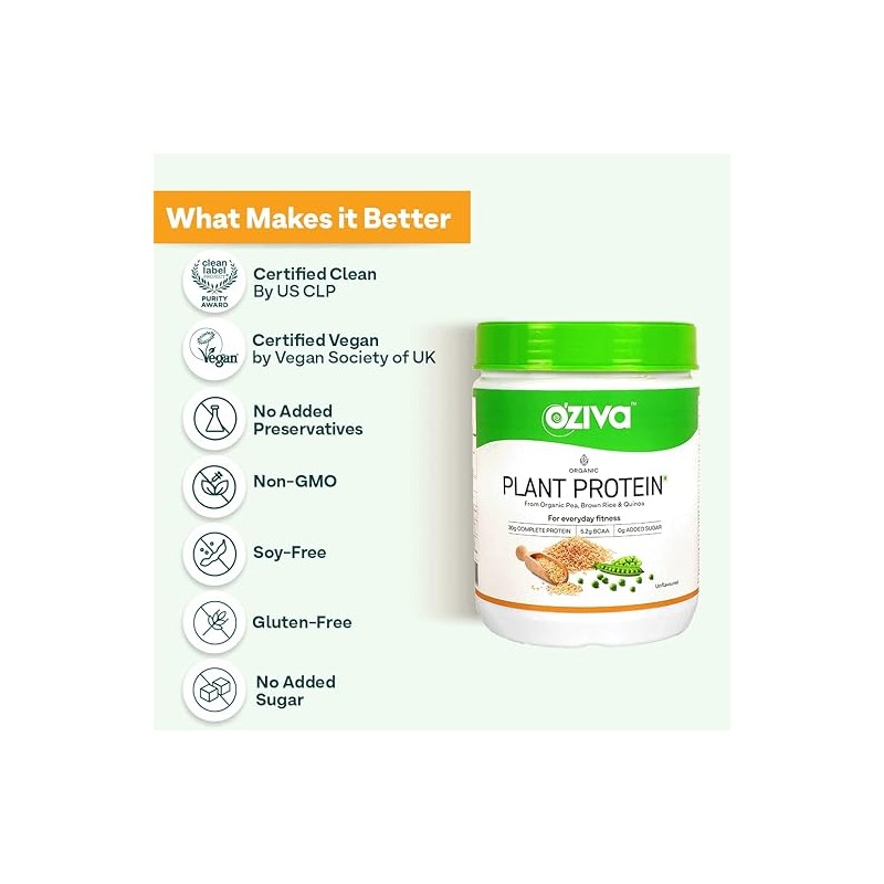 • OZiva Organic Plant Protein solves this problem by combining the power of pea protein, brown rice and organic quinoa to come up with a complete plant protein powder with 30g protein in every serving.