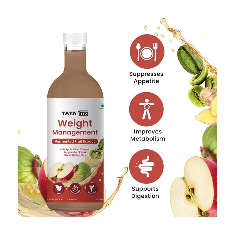 Tata 1mg Weight Management Juice with Green Coffee, Garcinia, Ginger, & Apple Cider Vinegar ACV Tata 1mg Weight Management Fermented Fruit Extract is a blend of apple cider vinegar with ginger, garcinia, and green coffee plus, which supports weight management and improves metabolism naturally. Apple Cider Vinegar reduces toxins in the body, generated due to improper digestion. Green Coffee has antioxidant properties and helps prevent oxidative damage caused by free radicals.