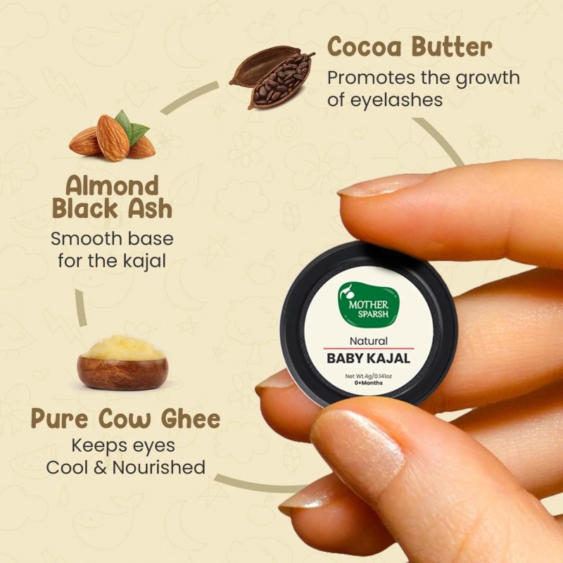 Mother Sparsh 100% Natural Baby Kajal with Zero Lead Content, Irritation Free & Safe for Newborns, With Almond & Pure Cow Ghee, Nourishes & Thickens Baby Eyelashes - 5gm