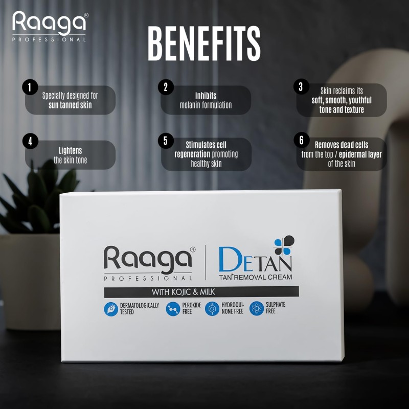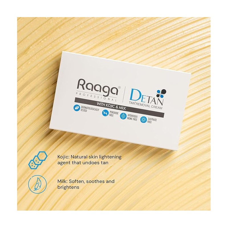 Raaga Professional De Tan Cream brings you the power of nature. Its unique formulation contains scientifically extracted actives of fruits and Kojic acid, Milk & Honey, help to remove the skin tan due to over exposure to sun.