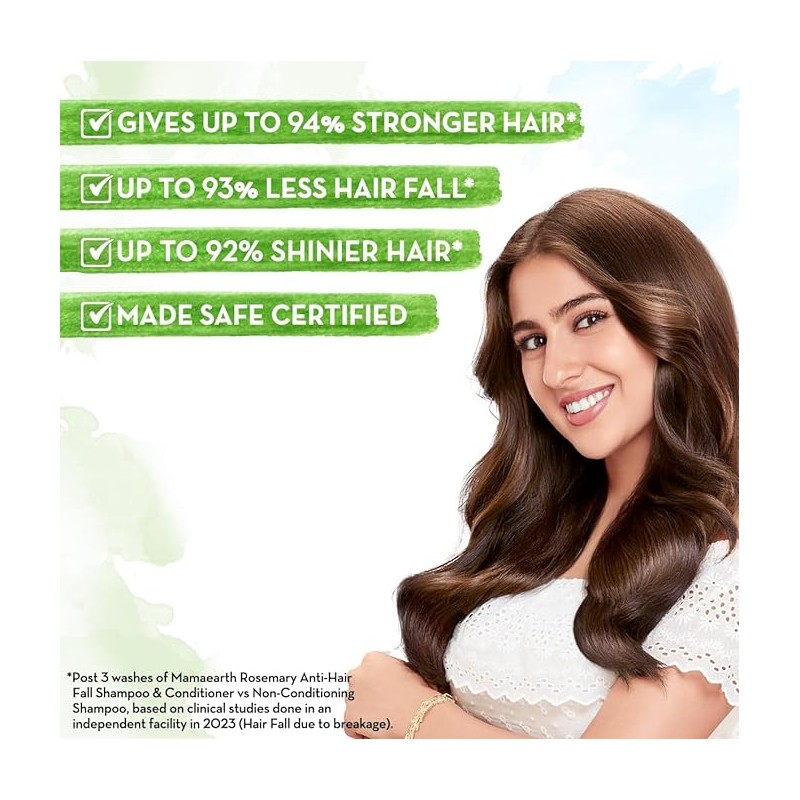 • *Post 3 washes of Mamaearth Rosemary Anti - Hair Fall Shampoo & Conditioner vs Non-Conditioning Shampoo, based on clinical studies done in an independent facility in 2023 (Hair Fall due to breakage).