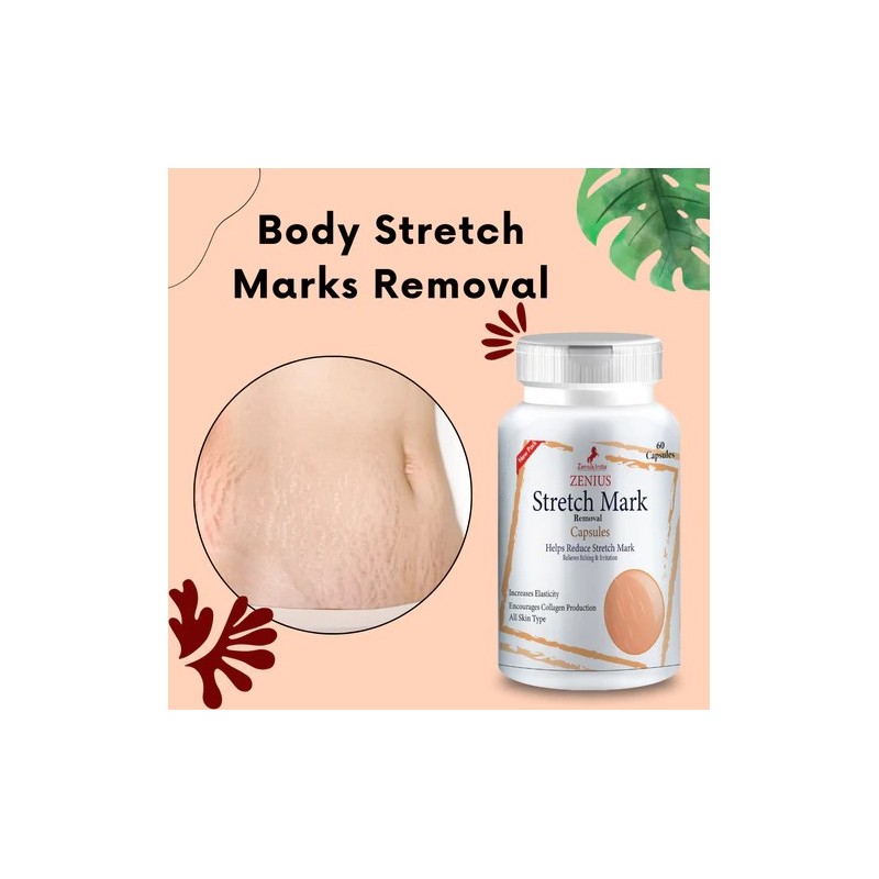Zenius Stretch Mark Removal Capsules are ayurvedic supplements that are designed to help reduce the appearance of stretch marks. Stretch marks are caused by the stretching of the skin and can occur during periods of rapid weight gain, pregnancy, or puberty. They are characterized by thin, discoloured lines or bands that can appear on various parts of the body, such as the abdomen, breasts, hips, and thighs. Zenius Stretch mark capsules typically contain a combination of ingredients such as vitamins, minerals, and herbal extracts that are believed to help improve the appearance of stretch marks. These ingredients may include Vitamin C, Vitamin E, Vitamin A, Zinc, Silica and other natural extracts known for their properties to help reduce the appearance of stretch marks.