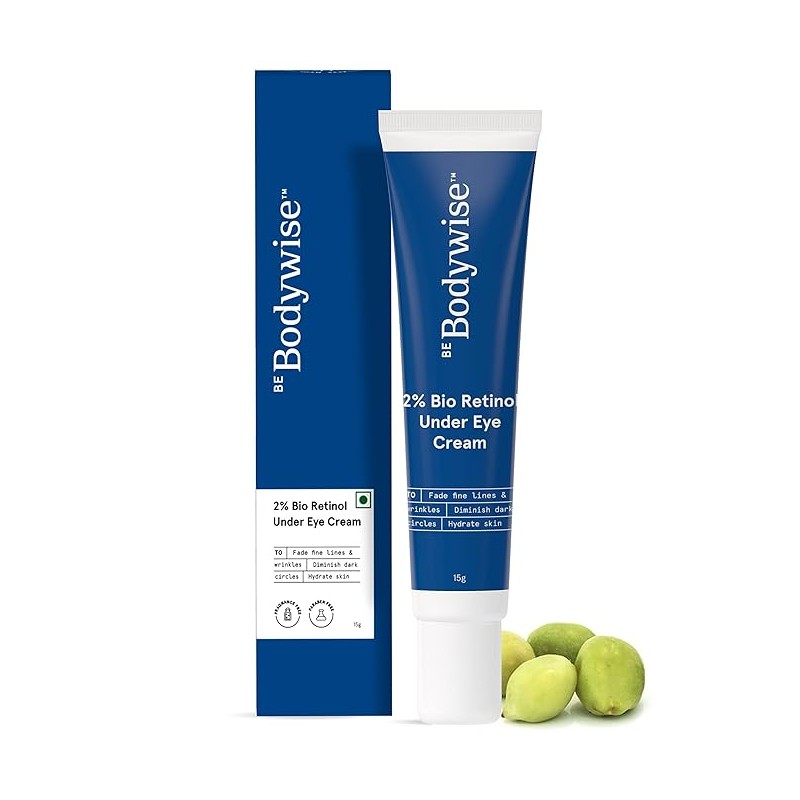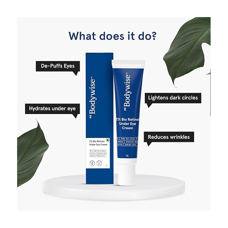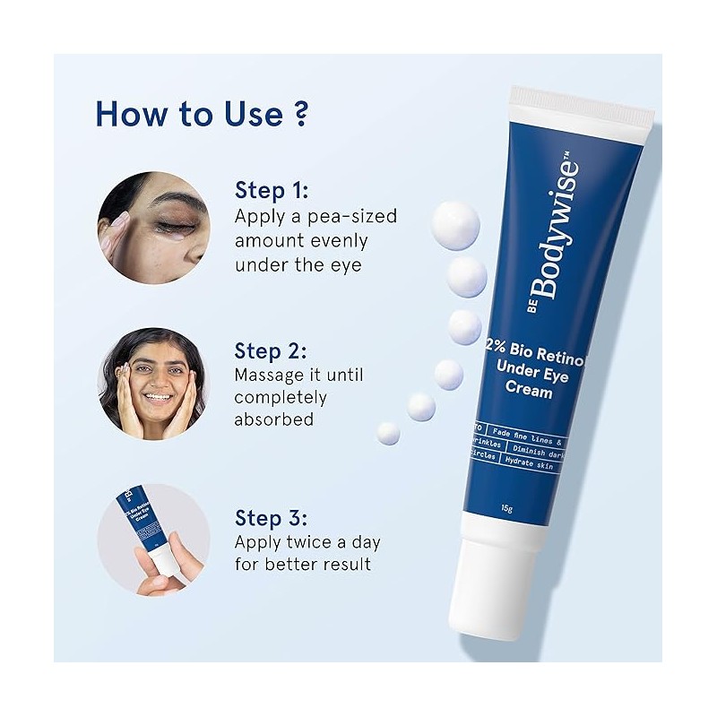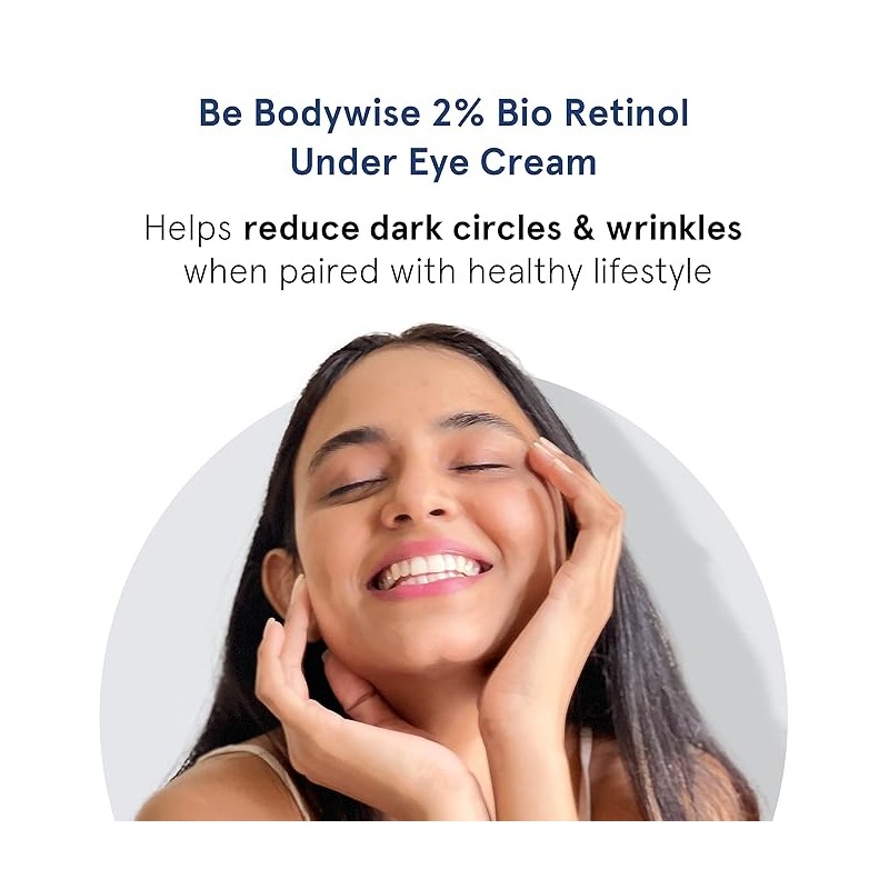 • Fades fine lines and wrinkles: Constant motion on face along with the loss of elasticity lead to fine lines and wrinkles. Bodywise Under Eye Cream is formulated with 2% Bio Retinol - a potent anti-ageing agent.
