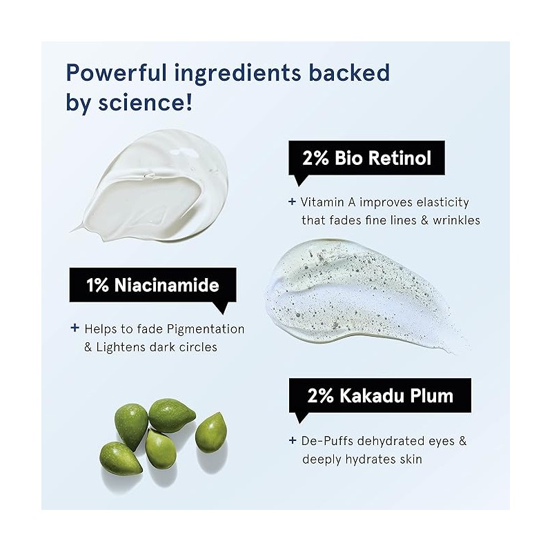 • This retinol eye cream is known to boost elasticity and collagen production. Regular application stimulates collagen diminishing the appearance of fine lines and wrinkles.