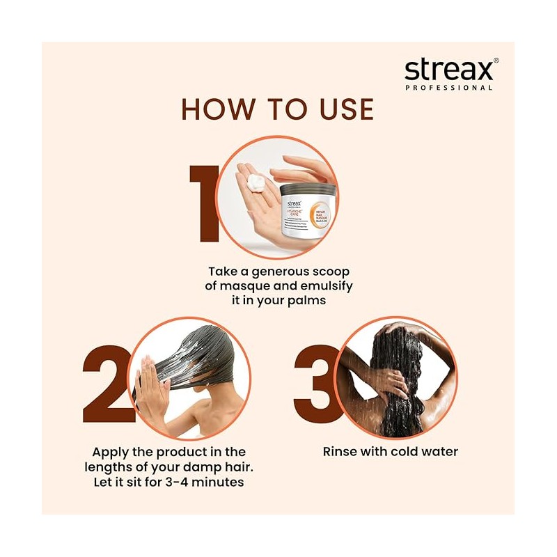 • Streax Professional Vitariche Care Smooth and Shine Hair Mask For Women- Hairmask Enriched with Biovit-A-OX Complex, Hydrolyzed Silk Protein, and Vitamins- For Soft, Smooth, and Rejuvenated Hair, 200g