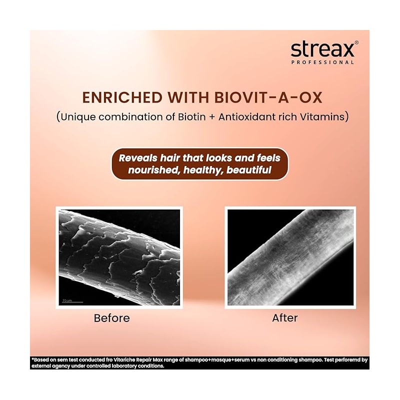 • ENRICHED WITH BIOVIT-A-OX €“ Streax Professional Vitariche Care Repair Max shampoo is enriched with Biovit-A-OX complex which is a combination of Biotin & antioxidants-Vitamin B5 & Vitamin E; REPAIRS & REJUVENATES DRY & DAMAGED HAIR €“ Streax Professional Vitariche Care Repair Max shampoo enriched with Flax protein and ceramide mimic molecules helps to repair & rejuvenate rough damaged hair