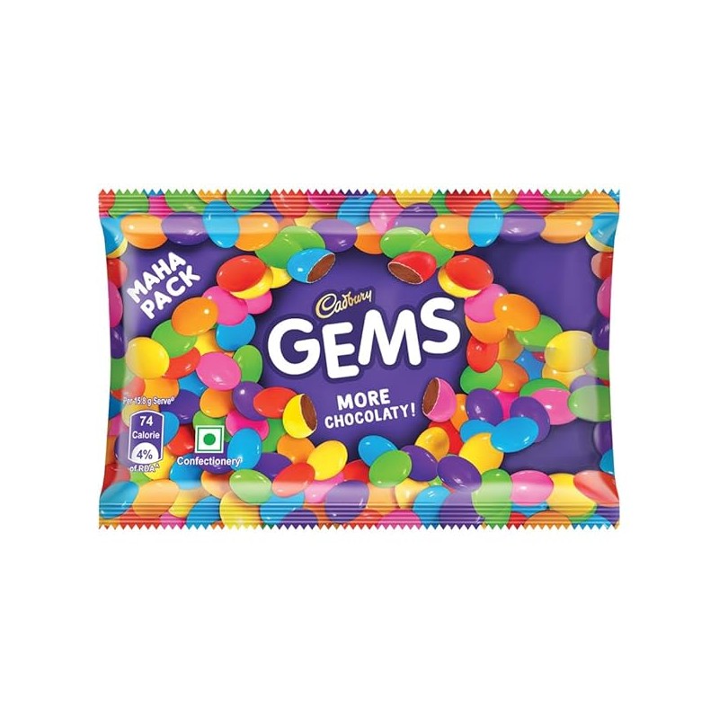 • Give a colourful touch to any dessert with these chocolate buttons or eat it directly from the fun pack for a chocolaty burst in your mouth. Delight your loved ones on special occasions like birthdays & get-togethers with Gems chocolate and gift them a Gems surprise.